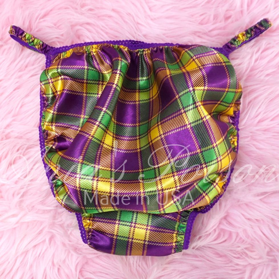 For your consideration are a very unique slippery smooth pair of bikini men’s Mardi Gras panties with a Nylon gusset.